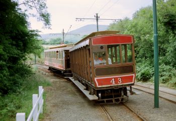 Trailer Car 43, hauled by Winter Saloon Car 22, pulls away from Cornaa to begin the steep climb towards Ballaglass on the 23rd July 1994. Trailer cars 43, 45, 48 and 61 along with Crossbench car 33 were all treated to the dismal red,teak and varnished pillars livery in the mid to late 1980s. (Photo…