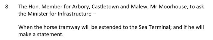 When the House of Keys sits, Arbory, Castletown and Malew MHK Moorhouse wants to know when the horse trams will run all the way to the Sea Terminal again.