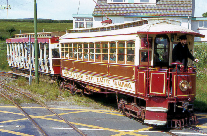 Car 1 and trailer 43 cross the main Douglas to Ramsey road at Ballabeg with a journey to Laxey. Harry Jones who later served as seasonal stationmaster at Derby Castle, can be seen at the controls.(Photo: Richard Pryke)